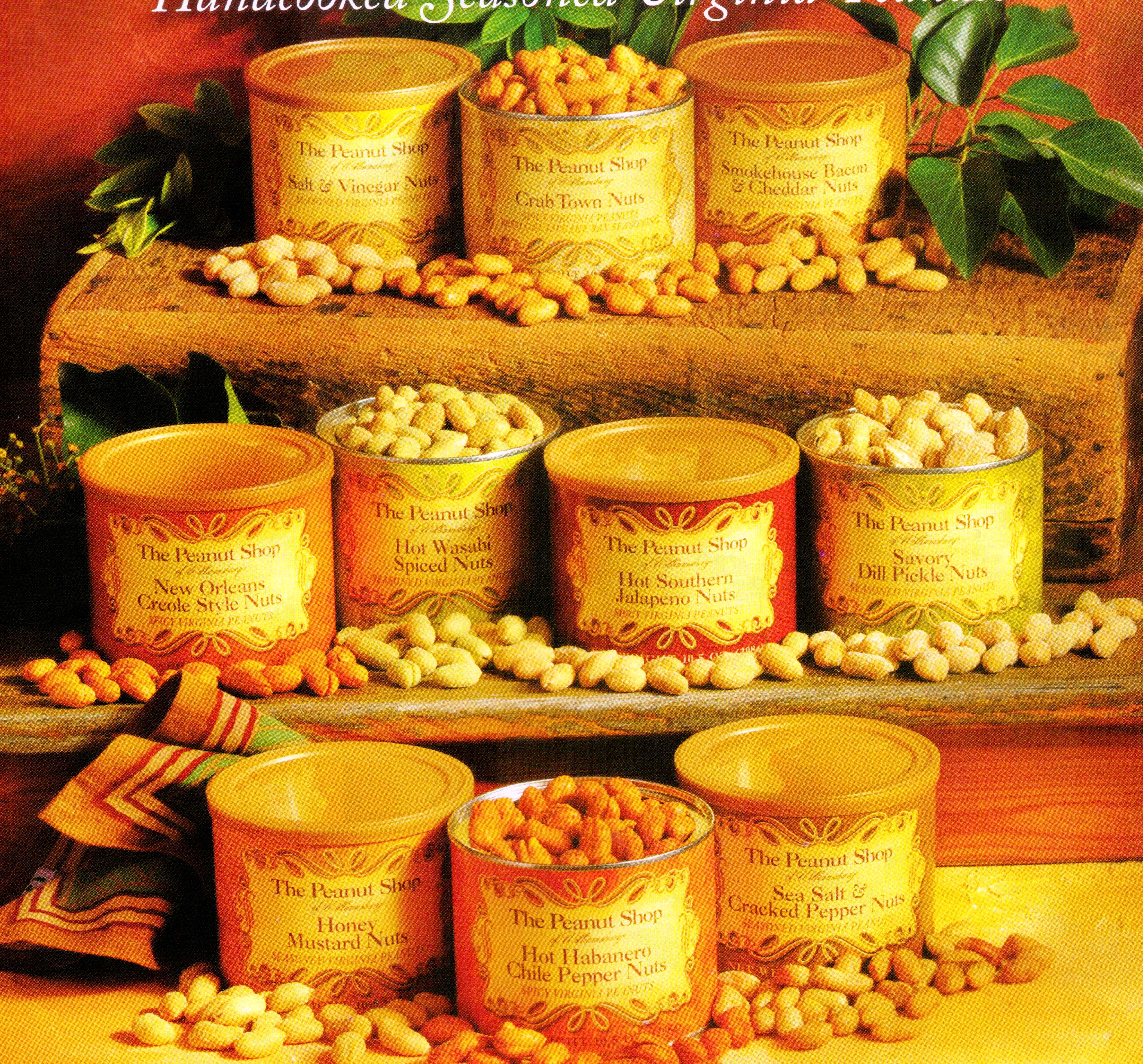 •  Recently added to our shelves are a fine selection of peanuts from “The Peanut Shop” of  Williamsburg.   You will find a great variety of flavors like Smokehouse Bacon & Cheddar Cheese, Savory Dill Pickle, Honey Roasted, Sea Salt & Cracked Pepper to mention a few and for you folks that like something a little less fancy there are the traditional peanuts….Salted, and Lightly Salted.